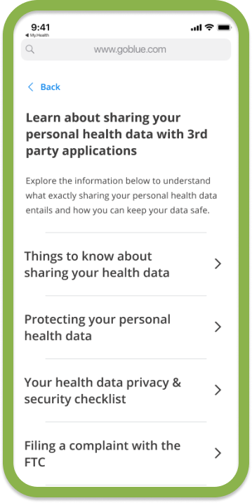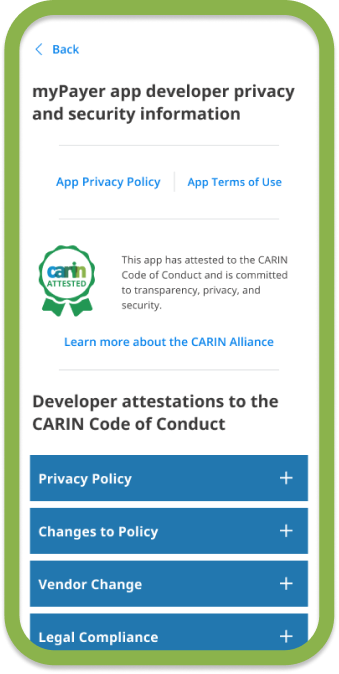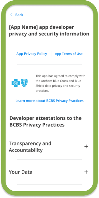 Since your members are about to share their data with a 3rd party app, they should have access to any information that may impact their decision, such as an app's Privacy Practices and Terms of Use. In addition to providing links to this information, be sure to call out any additional information provided by 3rd parties during the app registration process, such as attestations to the CARIN Code of Conduct or custom payer questionnaires.